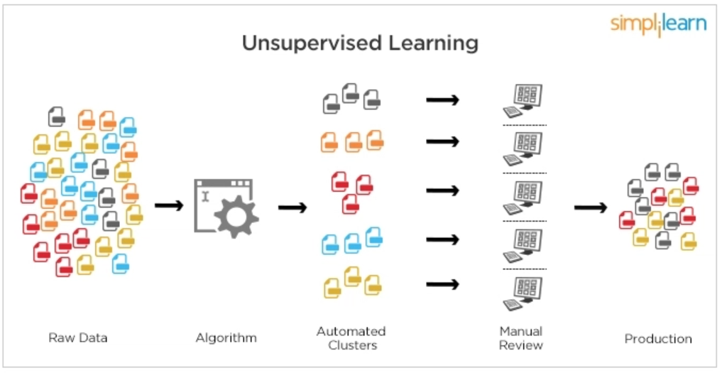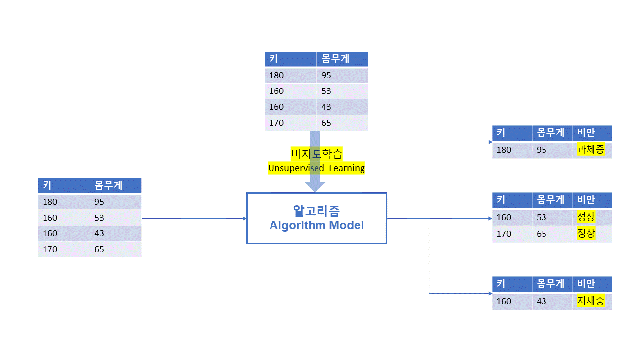 비지도학습은 지도학습과 달리 학습데이터 셋 내에 라벨이 존재하지 않는다. 데이터 셋 내에 비슷한 값을 가지는 자료들을 군집화하는 규칙을 만들어낸다.