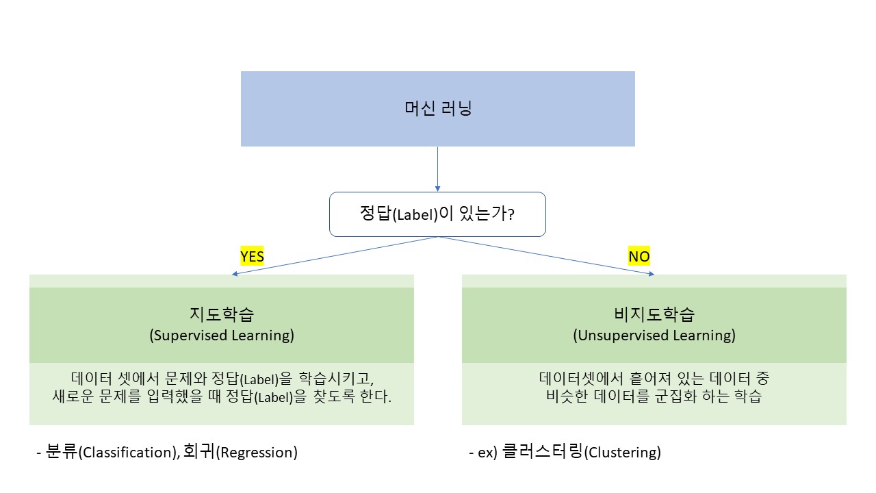 지도학습은 크게 분류(Classification)과 회귀(Regression)으로 나뉘어진다.