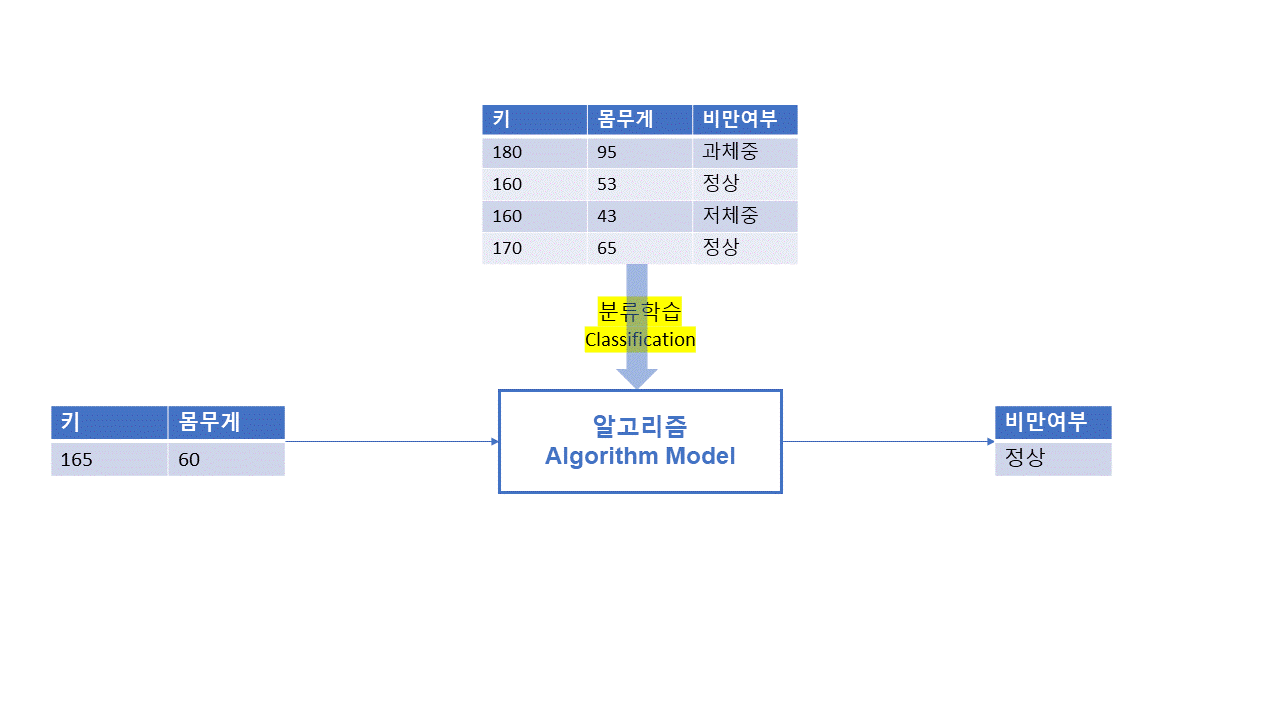 예) 사람의 키와 몸무게 등의 신체정보(X)와 비만여부(y)가 들어있는 훈련데이터를 통해 비만여부를 분류해내는 규칙(함수)를 발견해내는 것이다. 이를 통해 새로운 신체정보(x)가 들어왔을때 비만인지, 정상체중인지 등을 판단해내도록 하는 것이다.