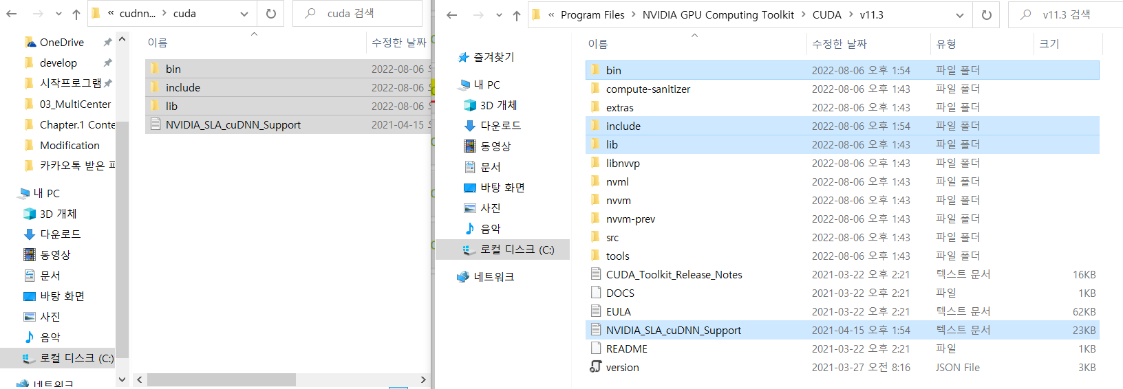 설치는 받은 cuDNN zip 압축을 푼 이후 내용물을 C:\Program Files\NVIDIA GPU Computing Toolkit\CUDA\v11.3 폴더에 덮어씌운다.