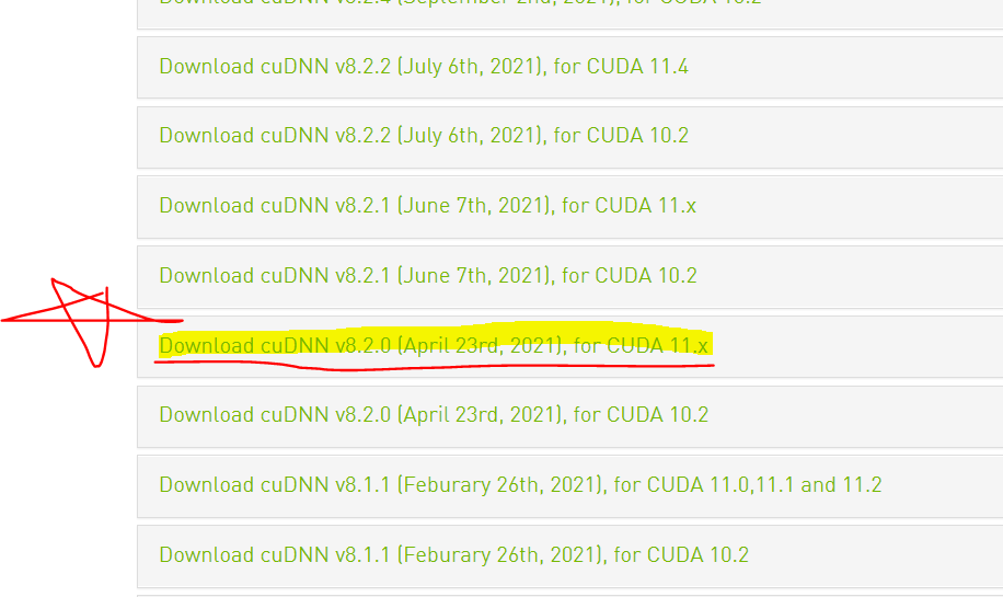 여기서 중요한 포인트는 cuDNN v8.2.0을 받아야 한다는 점이다.