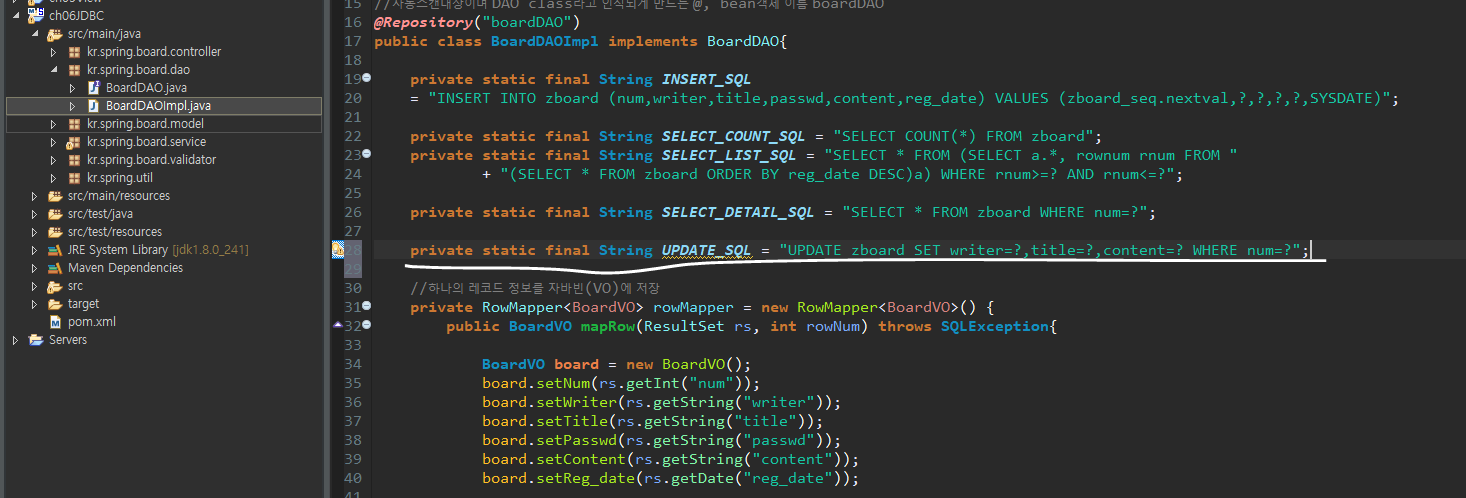 private static final String UPDATE_SQL = "UPDATE zboard SET writer=?,title=?,content=? WHERE num=?";