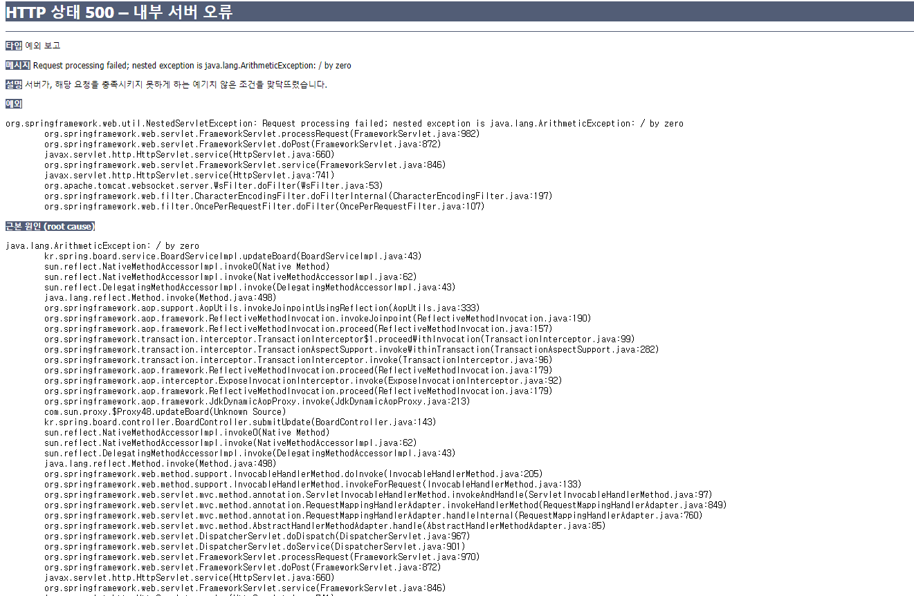 4) 에러 확인 : 게시글 수정 시도시 에러가 발생하고, 수정시도는 롤백되어 게시글이 수정되지 않아야 정상임.