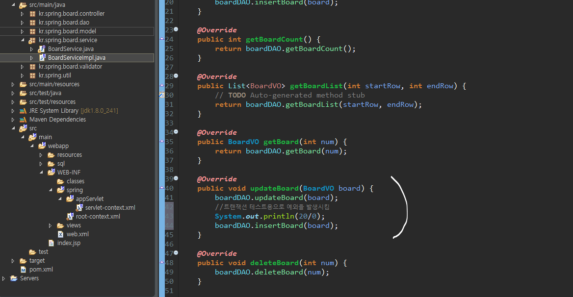 3)트랜잭션 테스트용으로 예외을 발생시킴