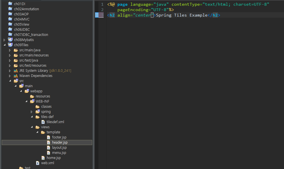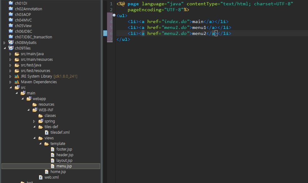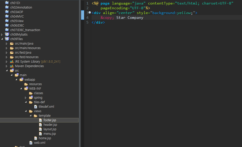tilesdef : 식별자 index에 설정된 WEB-INF/views/template/layout.jsp를 실행한다. 그리고