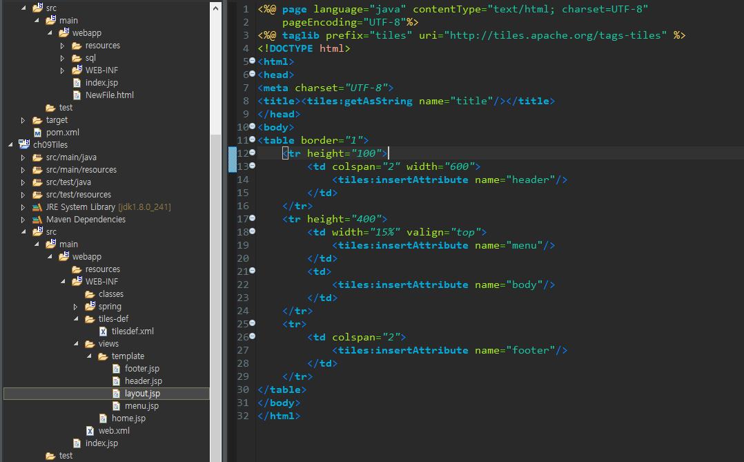 layout.jsp : <tiles:insertAttribute name="">를 통해 attribute를 불러온다.